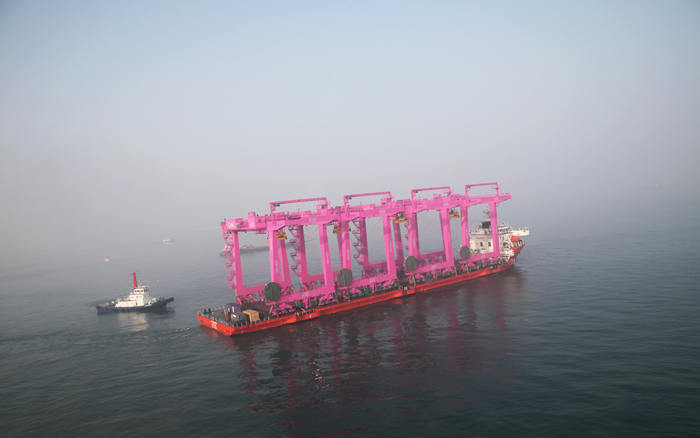 1月1日,青島海西重機為SNCT(韓國鮮光新港集裝箱碼頭有限公司)制造的8臺40噸自動化軌道吊第一批次(4臺)順利出海,成為2017年海西重機首批發(fā)運的港機設備。