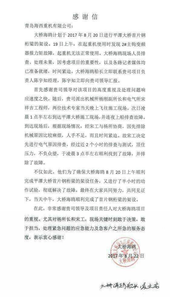 自今年年初設(shè)備交付以來(lái),海西重機(jī)定期安排技術(shù)人員進(jìn)行回訪,協(xié)助業(yè)主方對(duì)設(shè)備進(jìn)行檢查和保養(yǎng),及時(shí)處理故障,保證設(shè)備高效運(yùn)作,有力地保障了現(xiàn)場(chǎng)施工的可靠性和穩(wěn)定性,海西重機(jī)工作人員負(fù)責(zé)、用心的工作態(tài)度和完善的售后服務(wù)得到了業(yè)主方的一致好評(píng),業(yè)主特發(fā)來(lái)感謝信給予表?yè)P(yáng)。