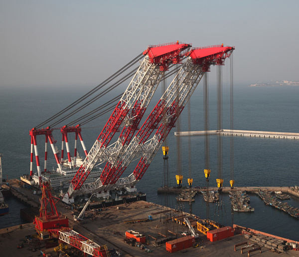 就是這個(gè)正在大顯身手的“大橋海鷗號(hào)”起重船,是由青島海西重機(jī)聯(lián)手武船集團(tuán)為中鐵大橋局量身打造的。3600噸浮式起重機(jī)作為起重船核心技術(shù)之一,由青島海西重機(jī)自主研發(fā)、設(shè)計(jì)、制造、安裝和調(diào)試,采用變幅式雙臂架結(jié)構(gòu),其起重重量為3600噸,最高起升高度110米,不僅減小了橋梁吊裝吊具結(jié)構(gòu),而且提高了橋梁吊裝的有效高度,能更好地滿足橋梁吊裝施工的要求,且經(jīng)受住了施工海域風(fēng)大、浪高、水深、流急等惡劣海況的考驗(yàn),成為大橋建設(shè)“左膀右臂”,被用戶親切地稱為“海上建橋神器”。