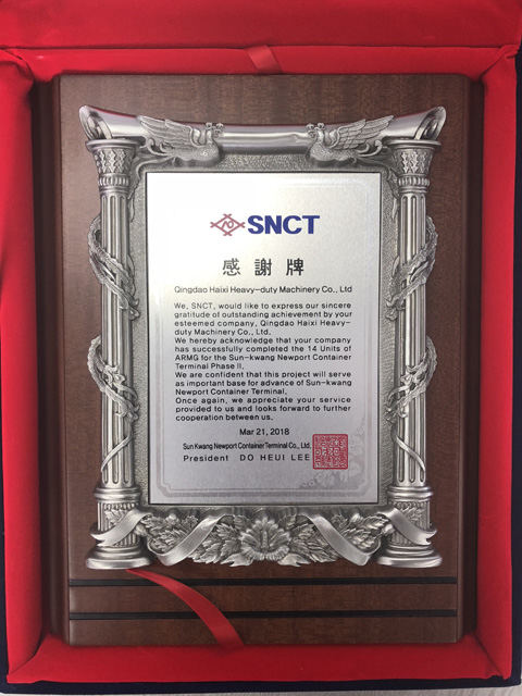 近日,海西重機(jī)收到來(lái)自韓國(guó)仁川新港鮮光新港集裝箱碼頭(SNCT)總裁李道熙代表SNCT授予的“感謝牌”,對(duì)海西重機(jī)在2017年和2018年兩個(gè)自動(dòng)化項(xiàng)目中的優(yōu)秀表現(xiàn)給予高度認(rèn)可,對(duì)海西所交付設(shè)備在碼頭發(fā)展中起到的重要作用表示感謝。