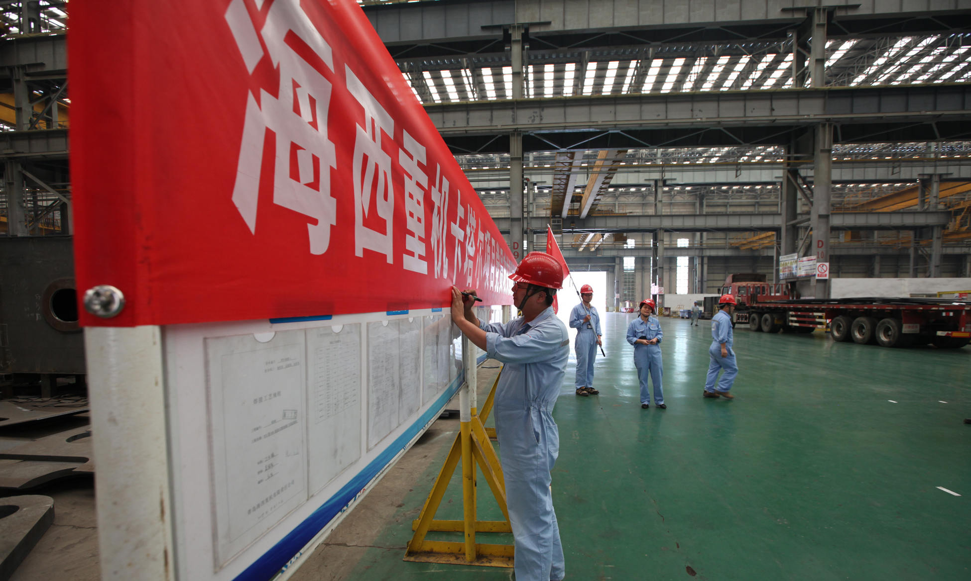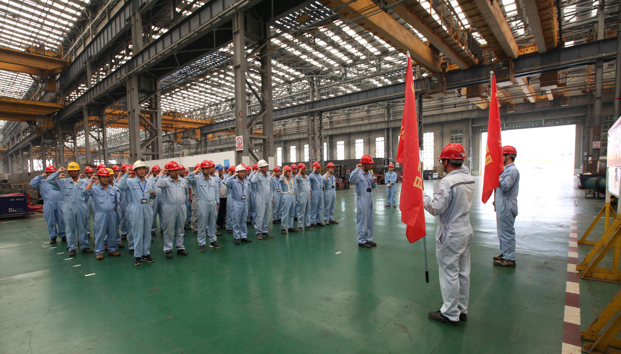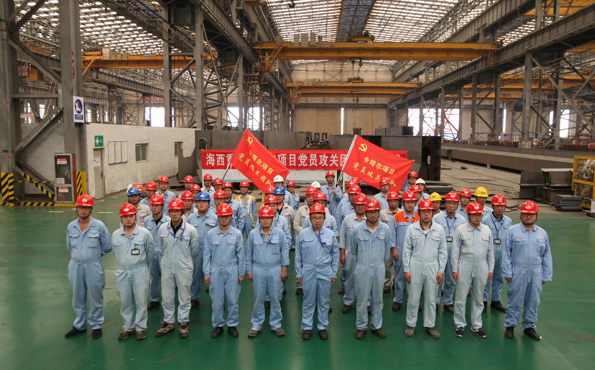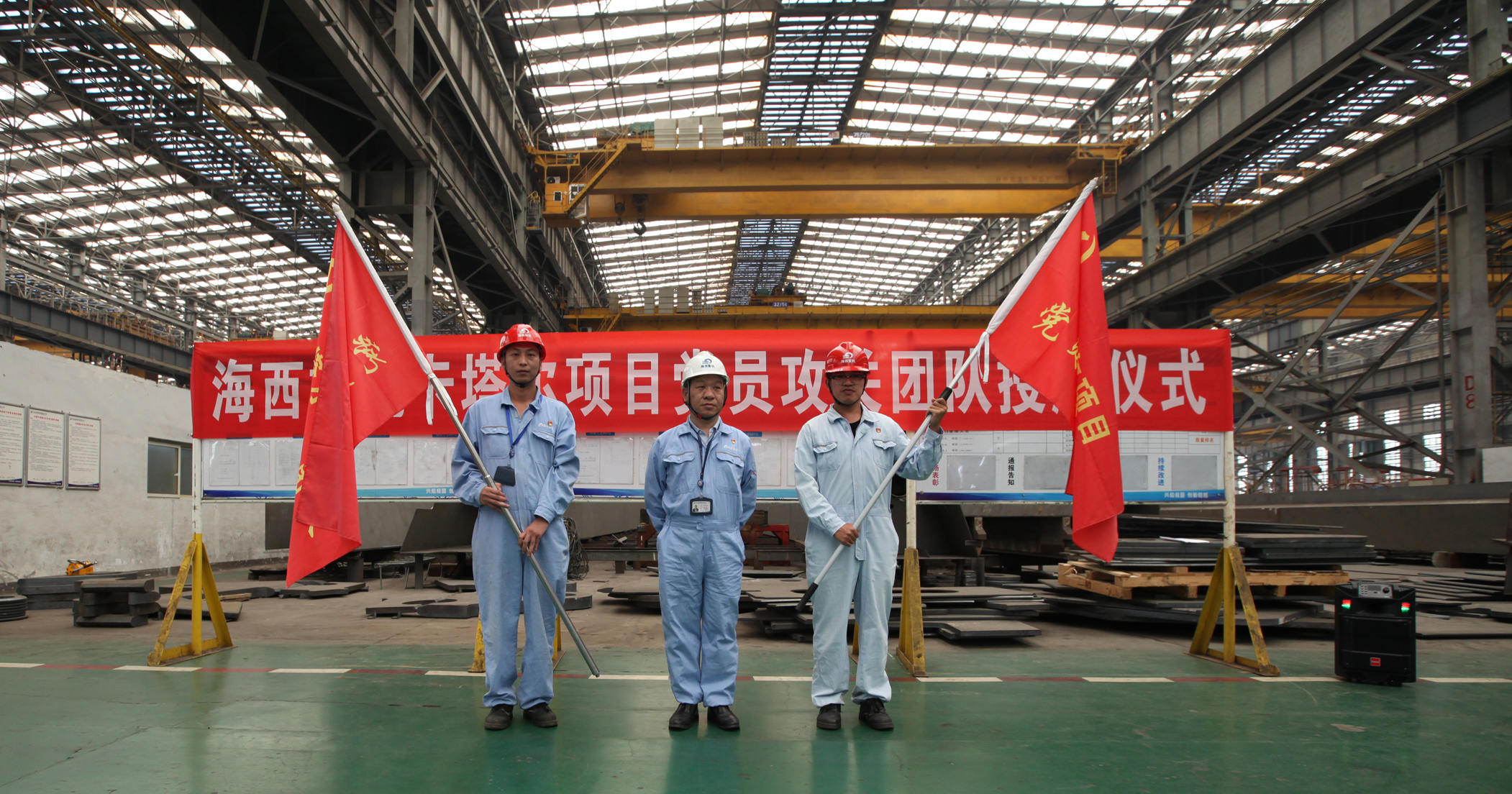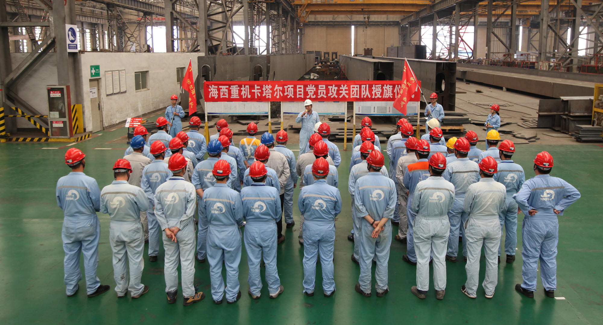 9月20日上午,卡塔爾項(xiàng)目黨員攻關(guān)團(tuán)隊(duì)授旗儀式在海西重機(jī)新鋼結(jié)構(gòu)廠房順利舉行。海西重機(jī)黨委書記、董事長鄧振山,黨委副書記、總經(jīng)理張懷志,黨委副書記、紀(jì)委書記朱聲凱,黨員骨干以及施工單位負(fù)責(zé)人等50余人參加本次授旗儀式。