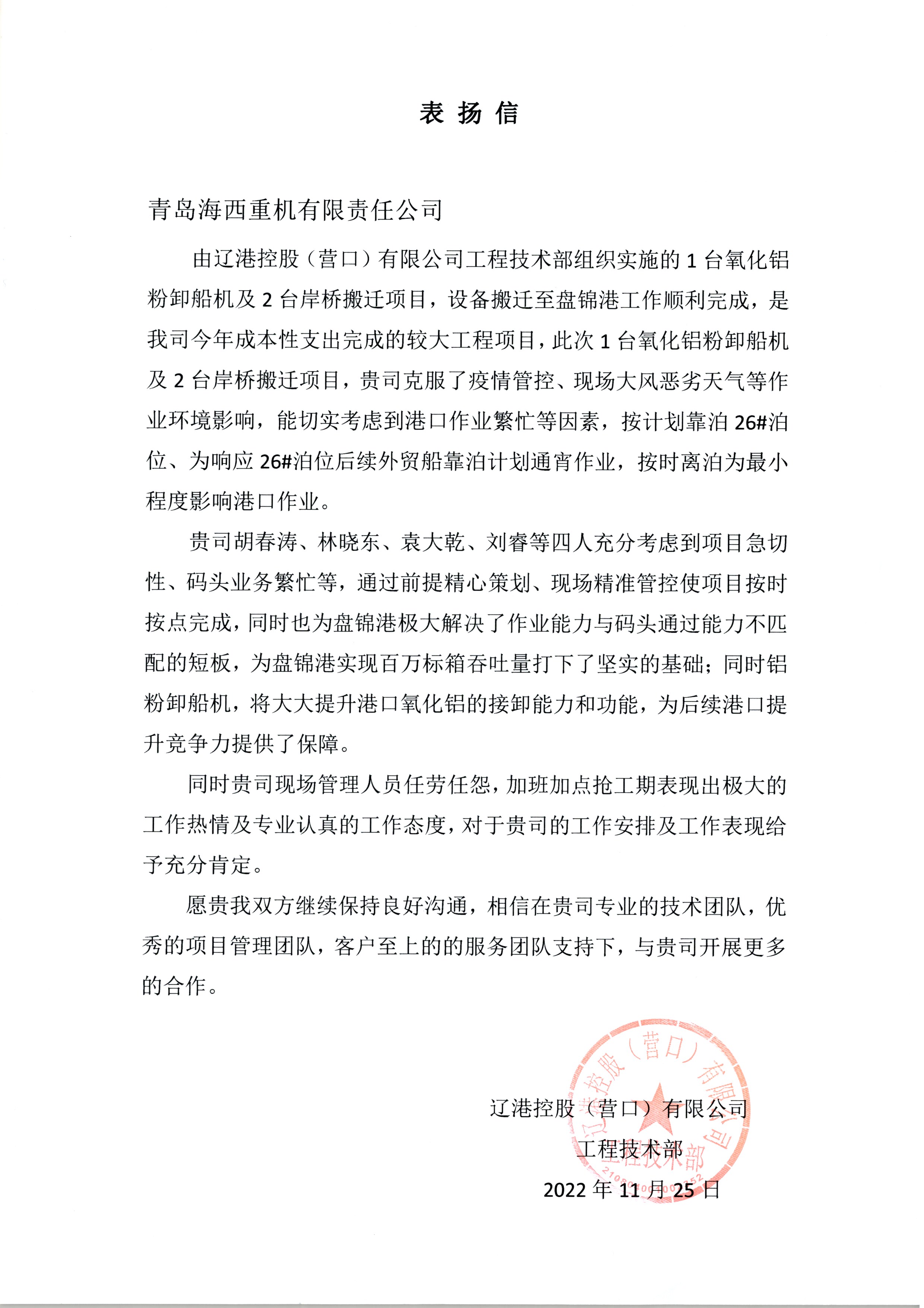 項(xiàng)目施工期間,正值當(dāng)?shù)匾咔榉揽鼐o張之時,經(jīng)過溝通協(xié)調(diào),在遼港控股、盤錦港集團(tuán)的大力支持下,特批了綠色通道,提供港內(nèi)食宿。項(xiàng)目攻關(guān)小組所有人員均食宿在碼頭,克服大風(fēng)、寒潮等惡劣天氣以及疫情帶來的不利因素,經(jīng)過20多天的晝夜奮戰(zhàn),設(shè)備最終安全高效、保質(zhì)保量的交付客戶使用。專業(yè)的人干專業(yè)的事,整個項(xiàng)目搬遷工作得到了客戶的充分肯定和贊揚(yáng)。
