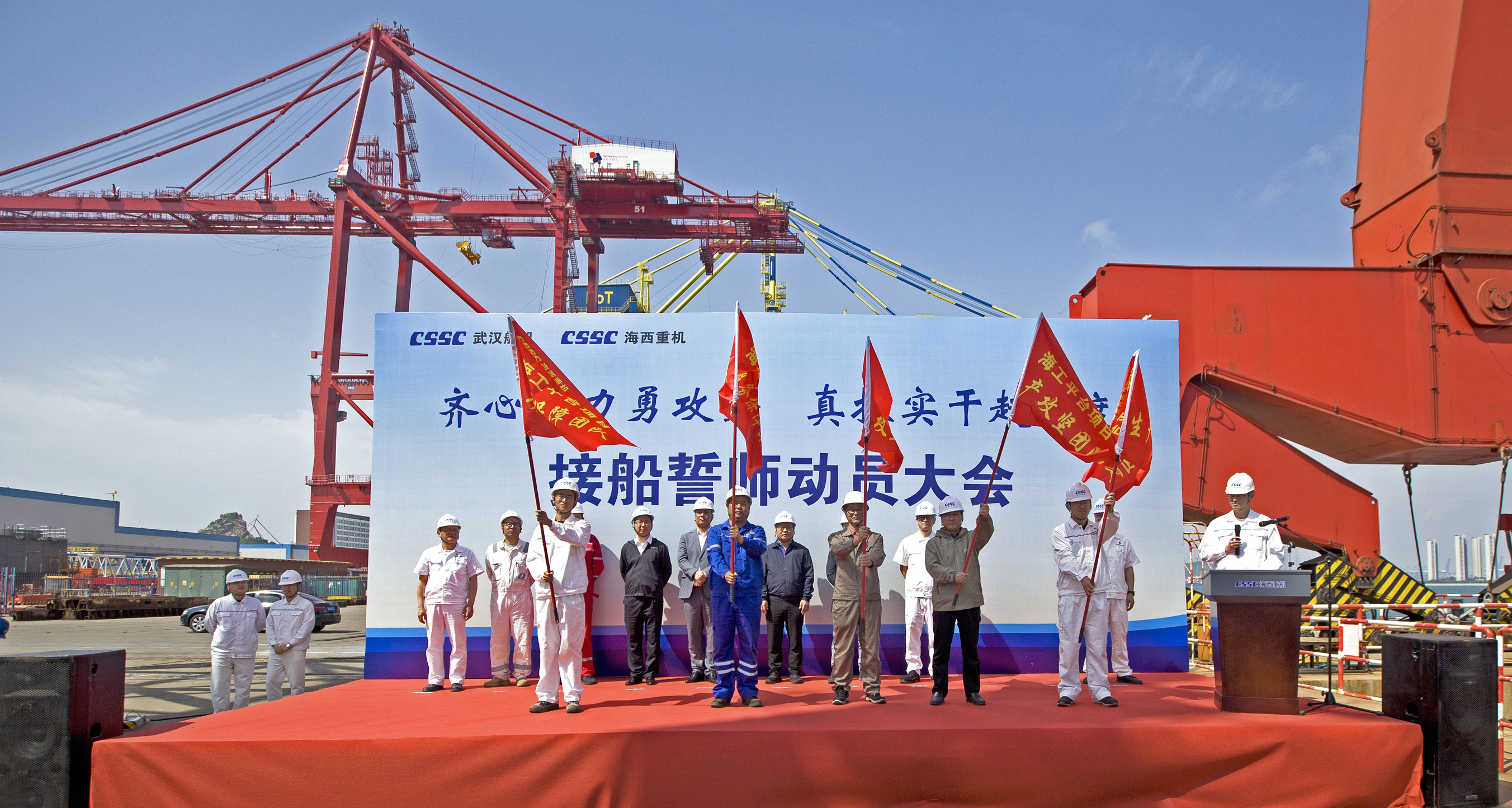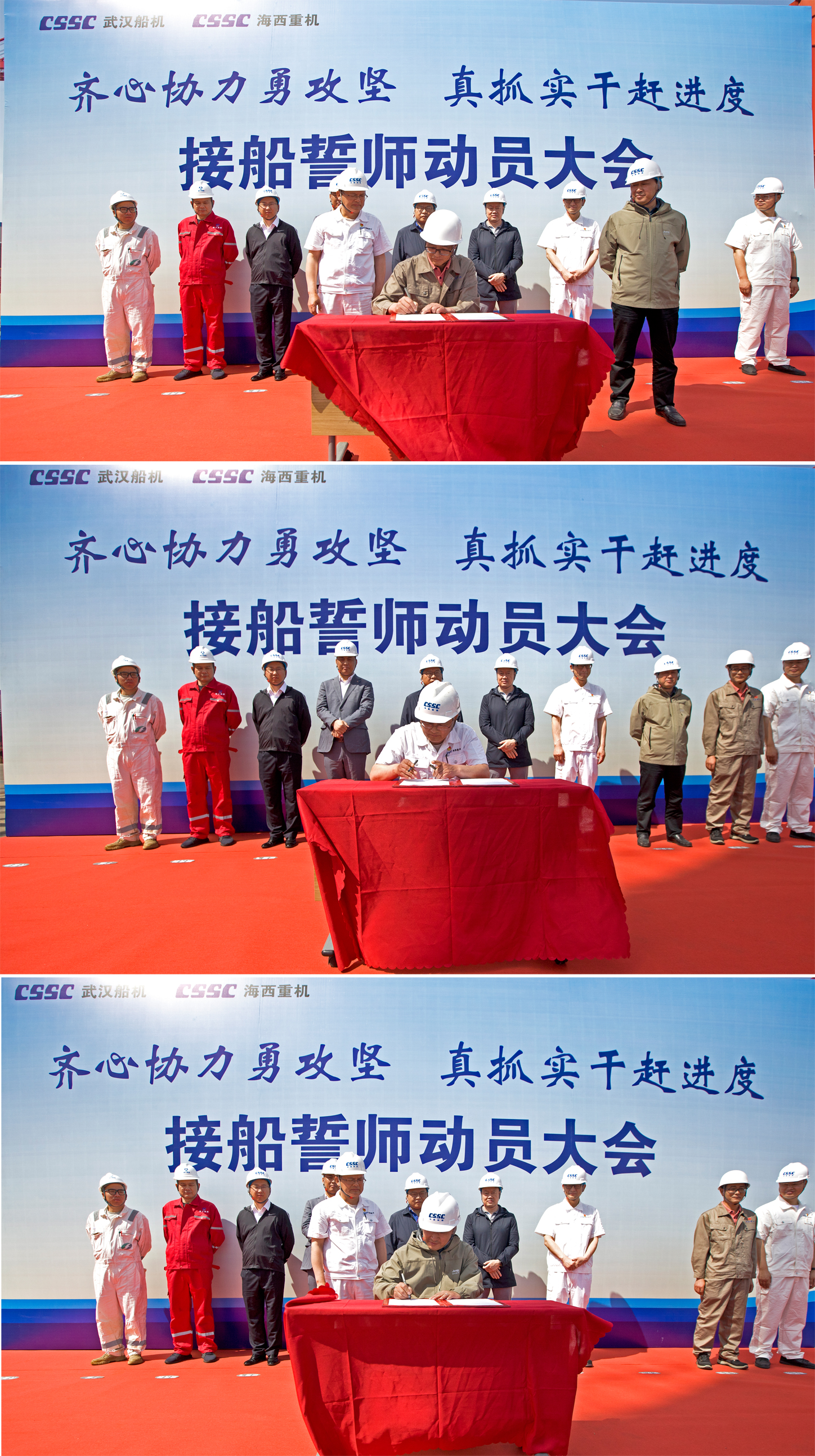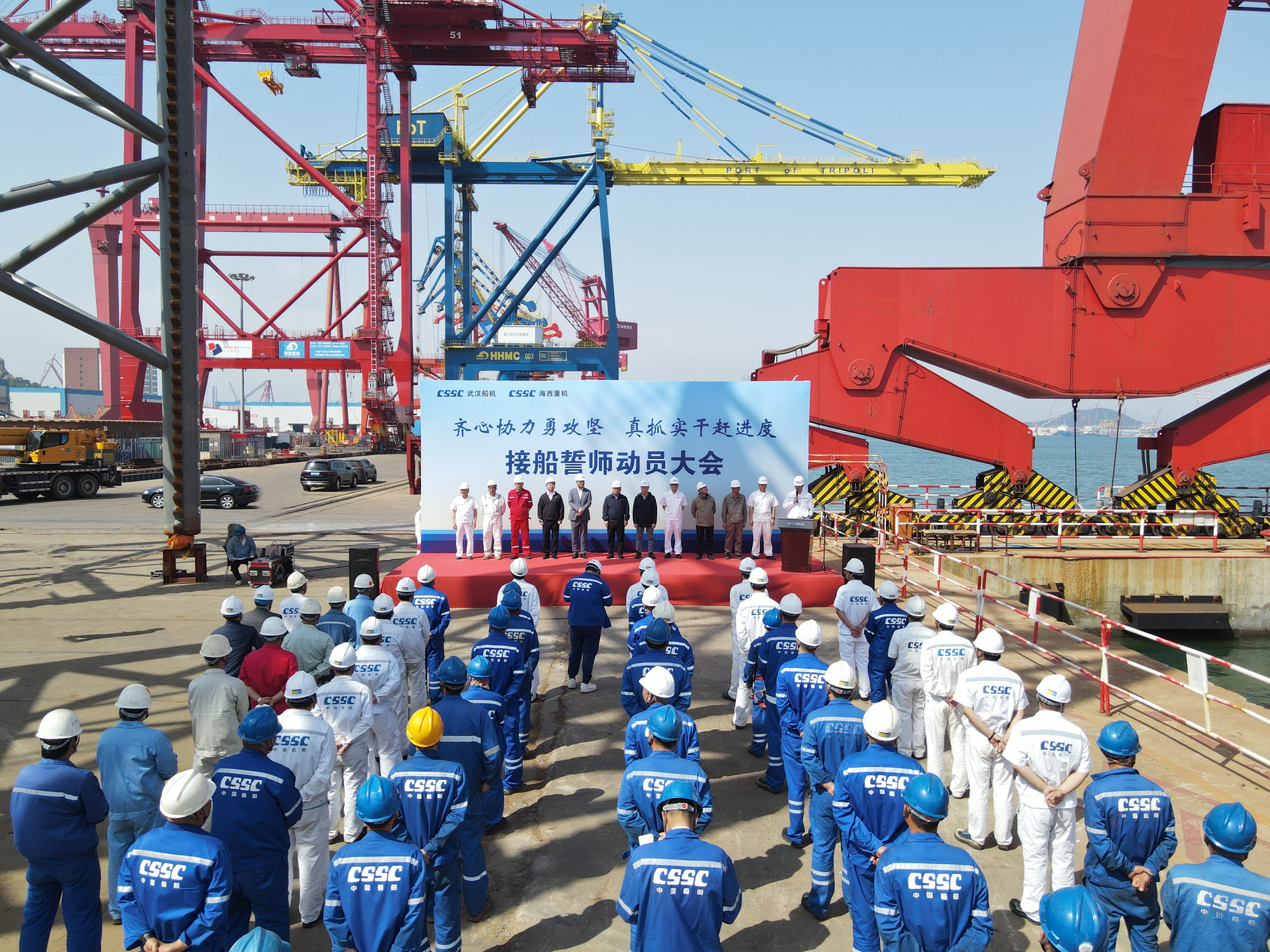 為了明確目標(biāo)、凝聚共識(shí)、齊心協(xié)力、克難攻堅(jiān),亮明迎難而上的堅(jiān)定信心和堅(jiān)強(qiáng)決心,動(dòng)員全員上下持續(xù)營造濃厚干事氛圍,掀起“齊心協(xié)力勇攻堅(jiān),真抓實(shí)干趕進(jìn)度”的高潮,全力以赴打好海工項(xiàng)目集中攻堅(jiān)戰(zhàn),5月25日上午,中國船舶集團(tuán)旗下武漢船機(jī)海西重機(jī)公司在生產(chǎn)現(xiàn)場組織開展接船誓師動(dòng)員大會(huì)。華夏金融租賃有限公司、北京神大集團(tuán)有限公司、飛勵(lì)特船舶管理有限公司、大津重工泰州分公司、江陰雙馬重工裝備有限公司、武漢船機(jī)海西重機(jī)等相關(guān)方參加本次動(dòng)員大會(huì)。
