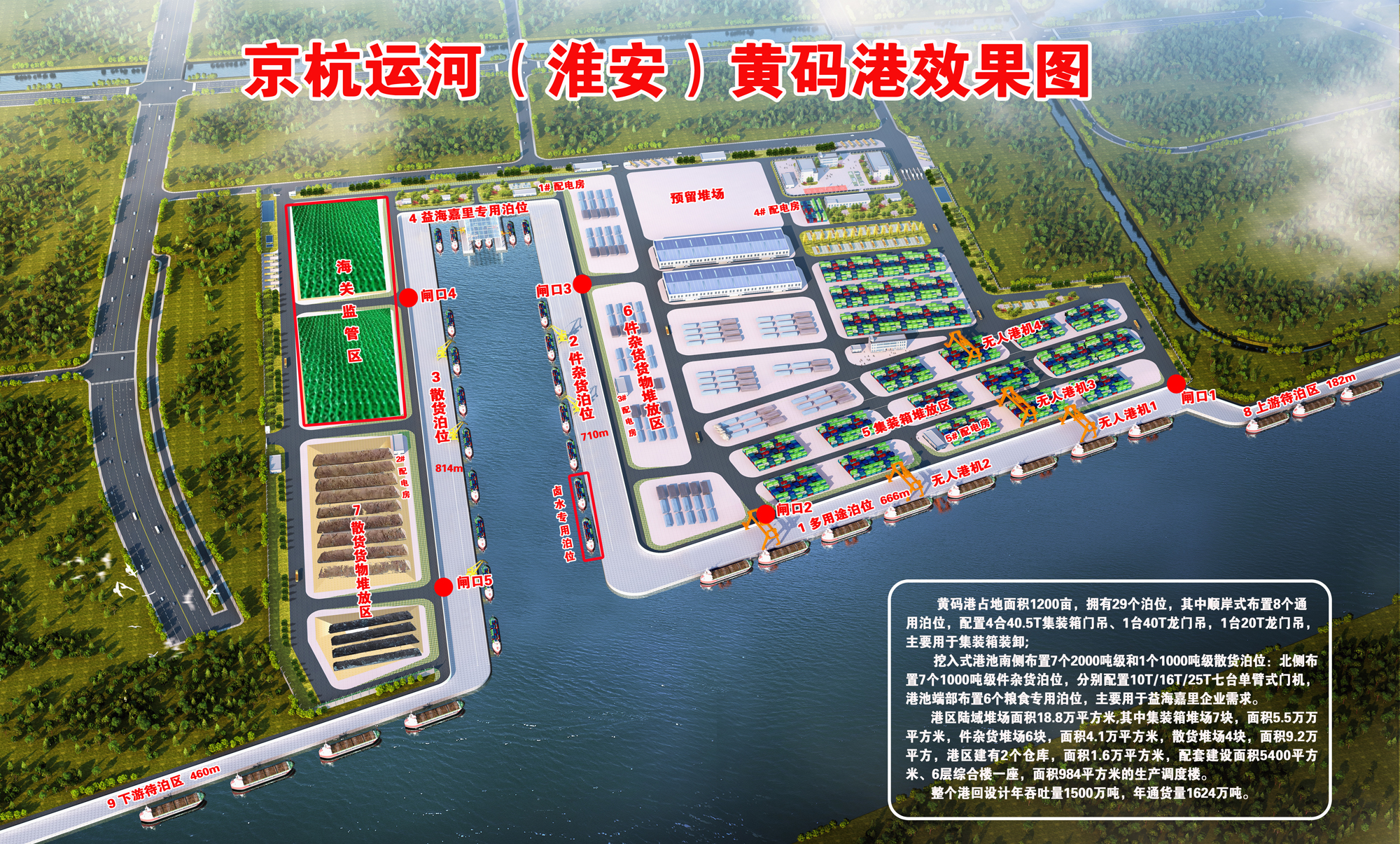 據(jù)了解,黃碼港位于京杭大運河和淮河入海水道交匯處,處于京杭運河蘇北段的中心,是通江達(dá)海、貫通南北的重要樞紐,是名副其實的“水上立交”。黃碼作業(yè)區(qū)項目規(guī)劃有29個千噸級裝卸泊位,可實現(xiàn)吞吐能力1650萬噸,是京杭運河沿線單體投資最大、泊位最多的港口,建成后將成為京杭運河主航道沿線重要的現(xiàn)代化內(nèi)河港口。