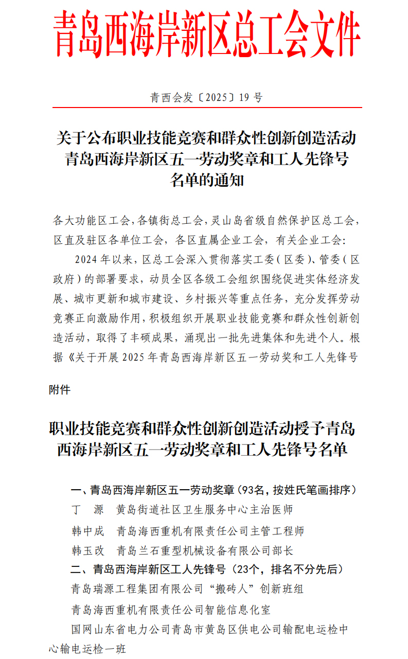 近日,海西重機(jī)智能信息化室榮獲西海岸新區(qū)“工人先鋒號(hào)”稱號(hào),主管工程師韓中成榮獲西海岸新區(qū)“五一勞動(dòng)獎(jiǎng)?wù)隆?。這一雙項(xiàng)殊榮的取得,既是對(duì)公司堅(jiān)持創(chuàng)新驅(qū)動(dòng)發(fā)展的認(rèn)可,更是對(duì)新時(shí)代產(chǎn)業(yè)工人矢志技術(shù)報(bào)國的褒獎(jiǎng)。