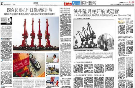 我公司為濱州港務(wù)有限責(zé)任公司承制的4臺MQ2533門座起重機于2012年7月10日運抵濱州港碼頭后,引起了當(dāng)?shù)卣鐦O大關(guān)注。濱州市委書記、濱州市長辦公室、濱州市委組織部、濱州市海事局、濱州市公安局、以及各縣區(qū)級領(lǐng)導(dǎo),先后到碼頭進行參觀指導(dǎo),濱州日報、魯北晚報更是多次到碼頭進行采訪報道。
