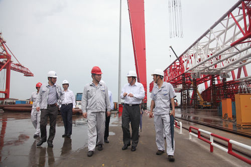 在參觀公司現(xiàn)場建成自用的1600噸龍門吊項目、正在吊裝上船的3600噸全回轉(zhuǎn)浮吊項目、面對公司的120米突堤碼頭以及繁忙的生產(chǎn)組裝現(xiàn)場,董總對公司的經(jīng)營發(fā)展態(tài)勢予以充分肯定。他說:在當(dāng)前市場經(jīng)濟(jì)低迷的形勢下,青島海西重機(jī)能夠抓住發(fā)展機(jī)遇,逆勢而上,尤其在技術(shù)創(chuàng)新和產(chǎn)品開發(fā)方面發(fā)揮了自身潛能,具有前瞻性和市場眼光,更是武漢船機(jī)公司在船市低迷的情況下,產(chǎn)品結(jié)構(gòu)調(diào)整的有力體現(xiàn)。董總特別對近期在煙臺、連云港、海南洋浦等港口項目投標(biāo)中,我司與上海振華同臺競標(biāo)并連續(xù)奪得標(biāo)的給予了高度肯定。
