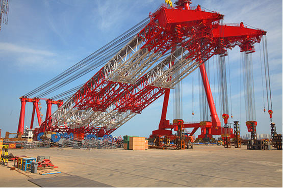 第一次穿繞超特長起重鋼絲繩:產(chǎn)品鋼絲繩直徑54mm、單根長度7000米(共4根),單套引繩12000米,合計數(shù)萬米的鋼絲繩通過兩套牽引設備在空中相距300米的60個滑輪之間來回穿梭,猶如巨龍在空中盤旋,空中曲線優(yōu)雅而美麗。利用海西重機突堤碼頭和1600t龍門吊的完美組合、設計獨特的工裝和工藝方案成功實現(xiàn)3600t浮吊的安裝,在海西重機是第一次,在國內(nèi)也屬首創(chuàng)。